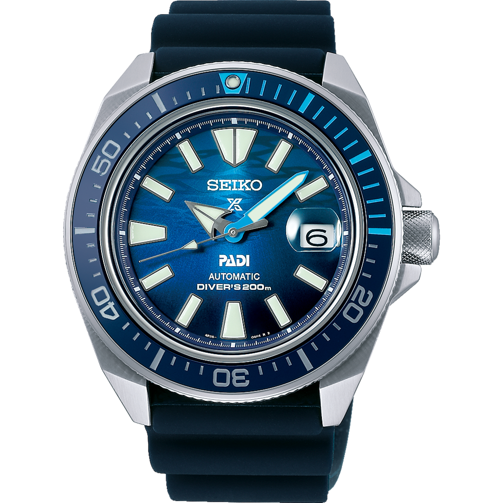 This automatic diver’s watch is designed around the classic look, it has a patterned blue dial with bright blue highlights. It features LumiBrite luminescent hands and markers as well as a date window.