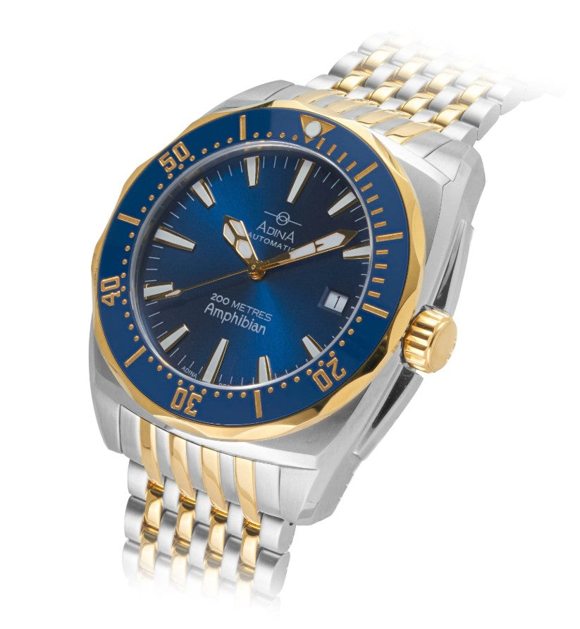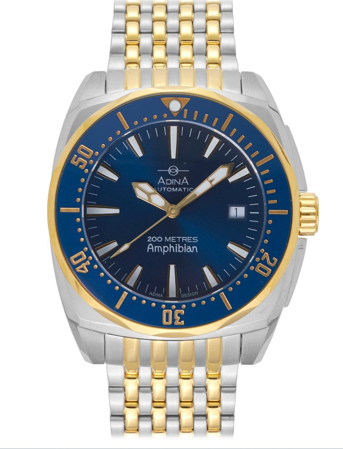 Regular price $1,495.00This Adina Amphibian automatic dive watch CT112 T6XB is not only built to last, but also to look good while doing so. The cold stamped nickel-free, two tone plated stainless steel case and bracelet give it a sleek and modern look. While the ceramic bezel adds a touch of sophistication. The luminous indexes make it easy to read in any lighting condition, while the date display adds convenience.
